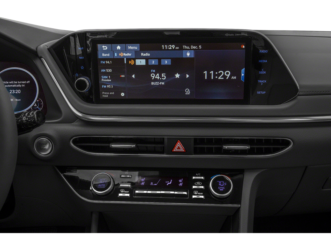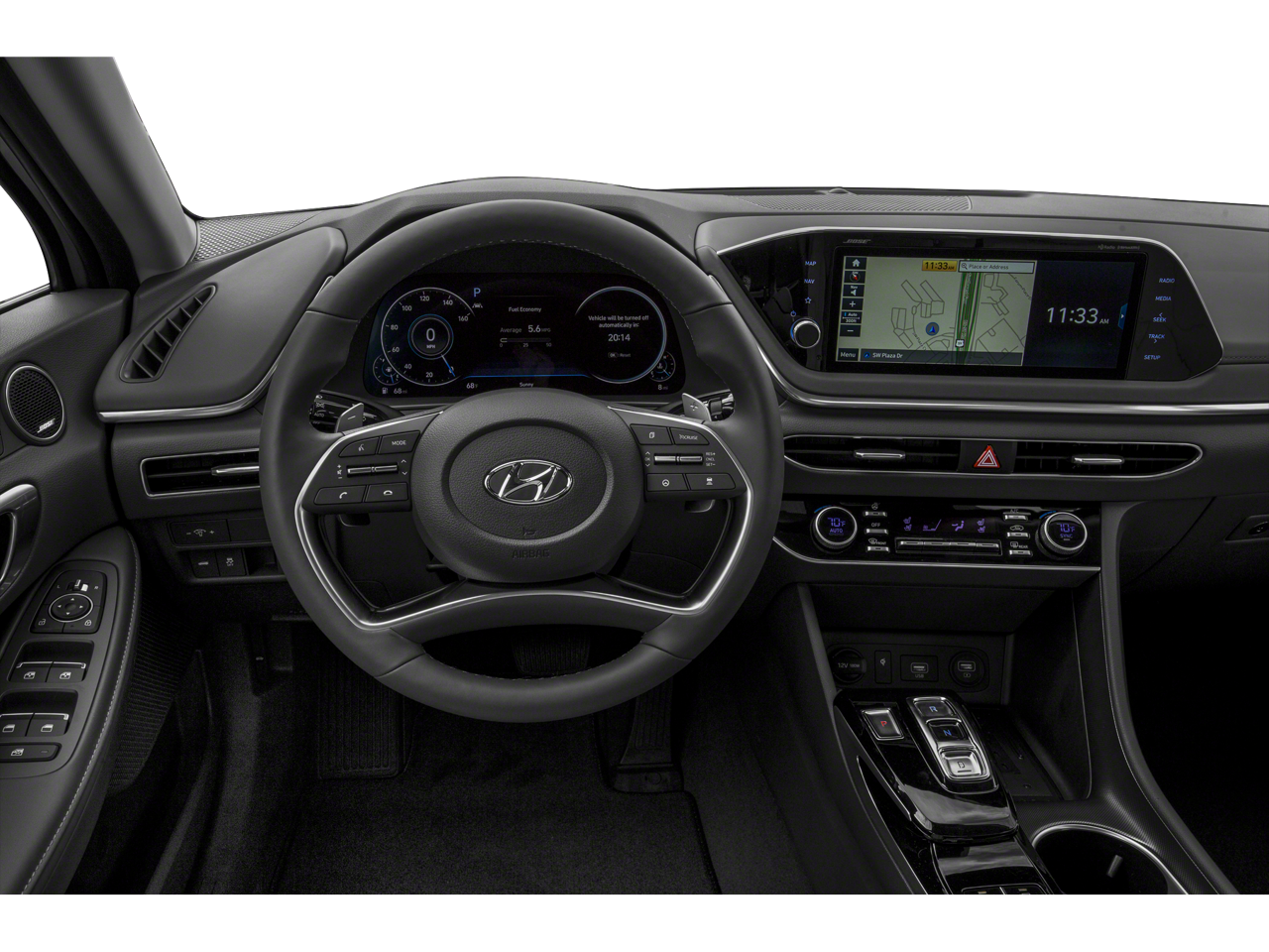- Radio: AM/FM/MP3/HD/SiriusXM Display Audio w/Nav -inc: 10.25" color touchscreen, Bose premium audio w/12 speakers (1 center channel, 2 dash, 2 front tweeters, 4 door mounted, 2 rear mounted speakers plus 1 rear mounted subwoofer), dynamic voice recognition, integrated Bluetooth®, Blue Link connected car system, Apple CarPlay, Android Auto, USB, diversity antenna for navigation and HERE HD traffic